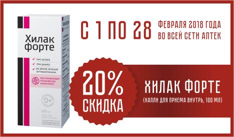 с 1 по 28 февраля 2018 года во всей сети аптек скидка 20% на хилак форте (капли для приема внутрь, 10 мл)